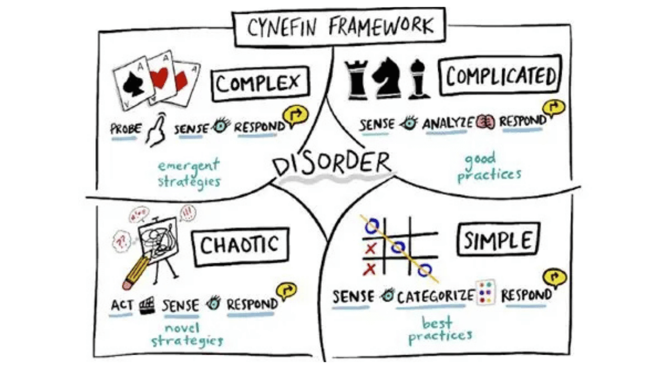 The Cynefin framework, developed by Dave Snowden, helps leaders distinguish between different types of problems: simple, complicated, complex, and chaotic. In complex contexts, cause and effect are only clear in hindsight. There are no best practices, only emergent ones. Leaders must probe, sense, and respond.